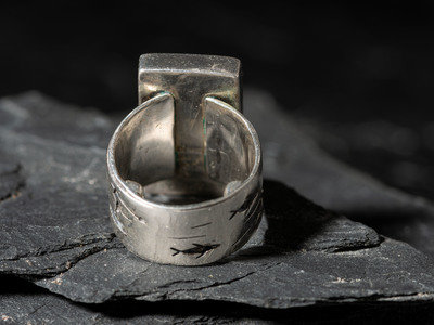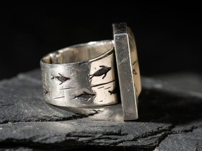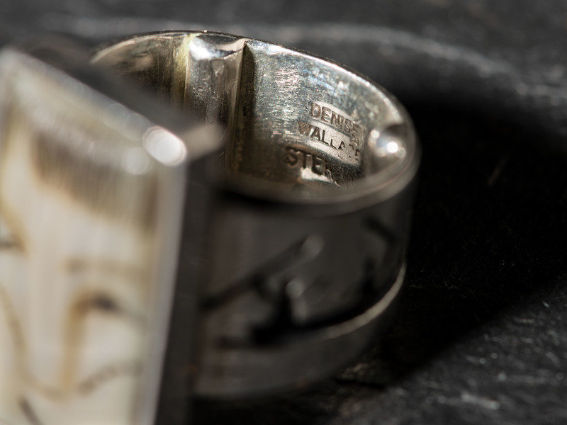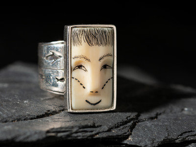 featuring a carved face with scrimshawed features; silver overlay hunting scene on band; marked STERLING, signed, and dated (worn)