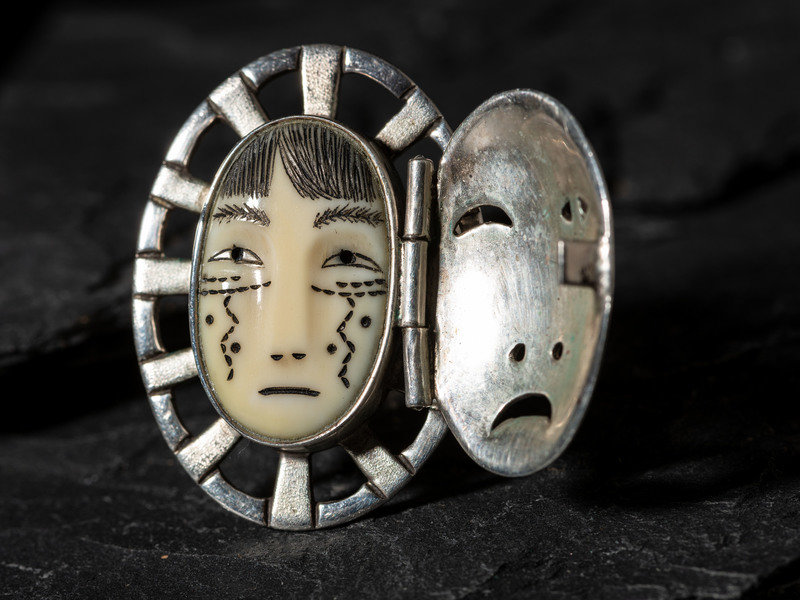 maskette opens to a carved and scrimshawed face; signed and marked STERLING