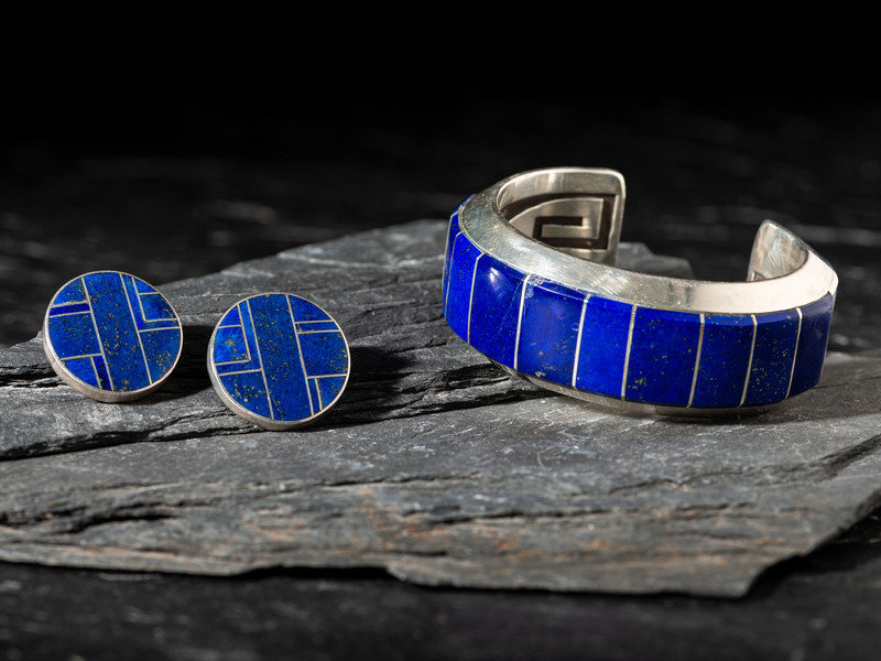 Sterling Silver and Lapis Cuff Bracelet and Post Earrings