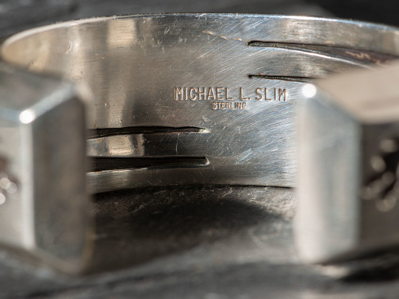 cuff with channel inlay and Kokopelli designs on the ends; signed MICHAEL L. SLIM and marked STERLING