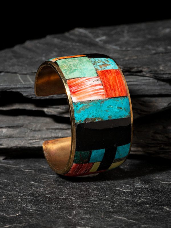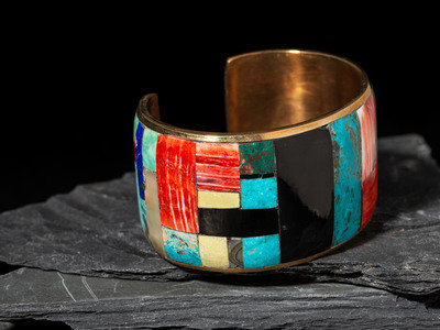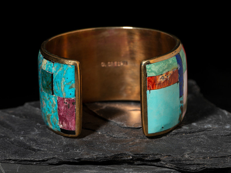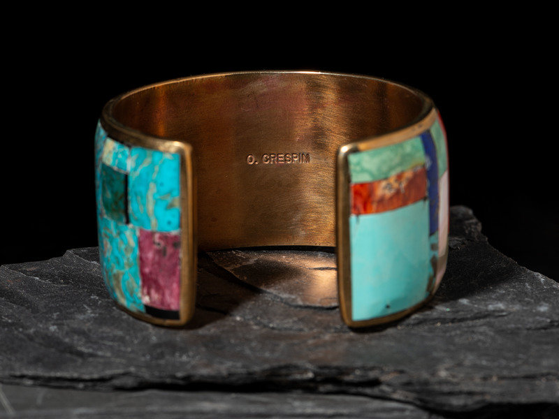 set with turquoise, jet, and spiny oyster; signed O. CRESPIN