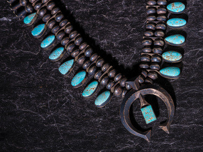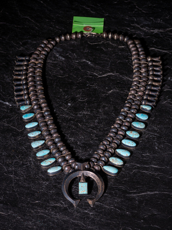 Navajo Silver and #8 Turquoise Squash Blossom Necklace, with Pawn Tag