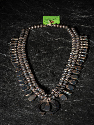 double-strand necklace featuring a sand cast naja with rectangular shaped cabochon and a total of thirty-six squash blossoms, twenty are traditional silver and sixteen set with #8 Turquoise stones; not marked