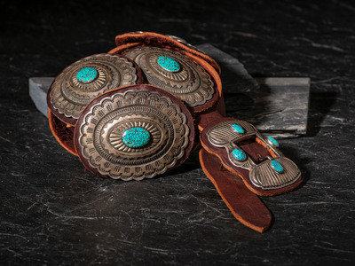 belt length 47 inches x width 1-1/4 inches, concha length 4-1/2 inches x width 3-1/2 inhces, buckle length 3-1/2 inches x width 2-1/2 inches, total weight 665.3 dwt.