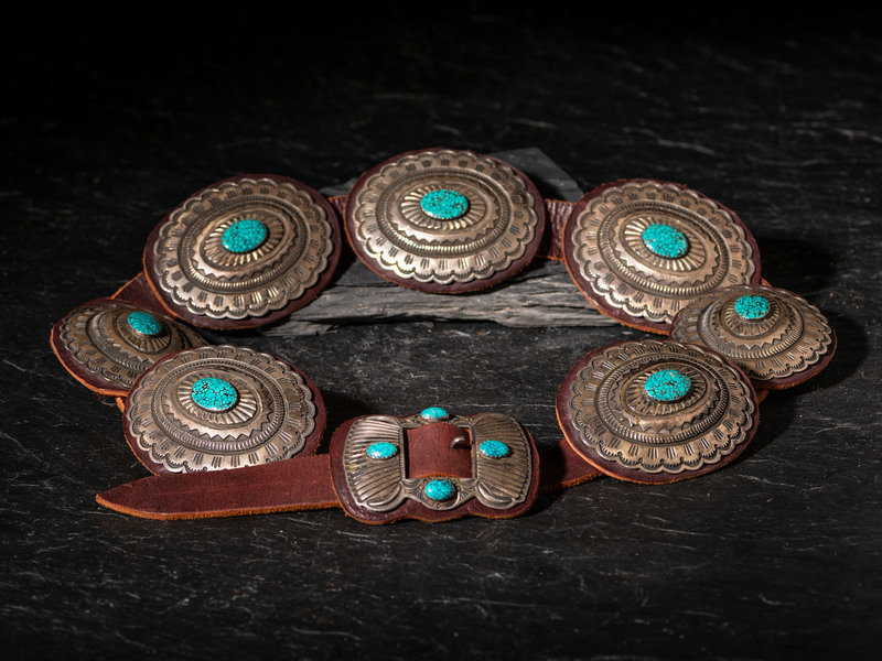 large traditional form with seven heavily stamped scalloped conchas and set with a single cabochon; matching rectangular buckle set with four cabochons; marked STERLING and C.MTZ housed in an arrowhead hallmark