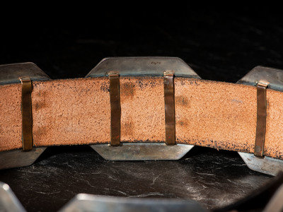 belt length 36-5/8 inches x width 2 inches, concha and buckle length 4 inches x width 3 inches, total weight 636.8 dwt.