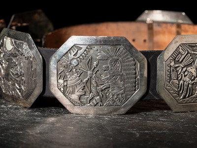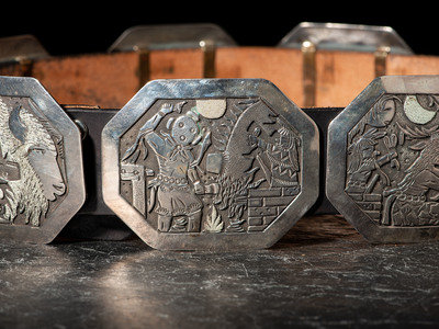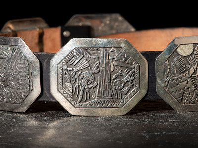seven conchas and buckle, each with a different story being told; signed B. B-C-T and dated on back of buckle