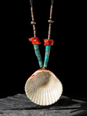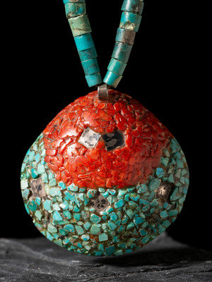 single-strand necklace strung with silver cones and beads, rolled turquoise, heishi, and coral; featuring a turquoise and coral chip inlaid shell pendant; not marked