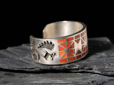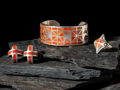 Zuni Silver and Channel Inlay Coral Cuff Bracelet, Ring, and Post Earrings