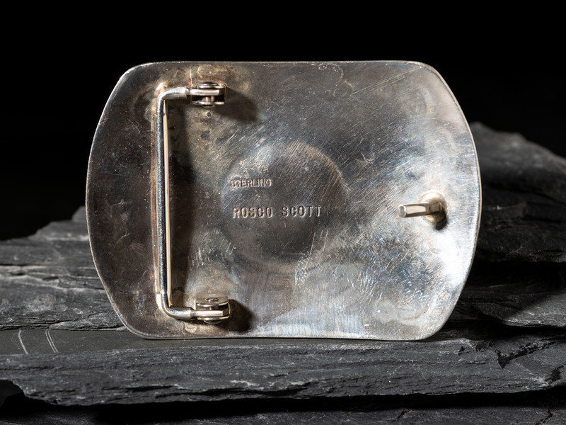 a rectangular example with rounded edges; coral cabochon clusters; signed ROSCO SCOTT and marked STERLING