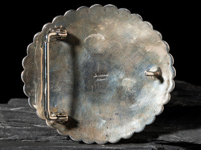 an oval example, heavily stamped with scalloped edges and featuring a center cluster of coral cabochons forming a cross; signed D. CADMAN and marked STERLING