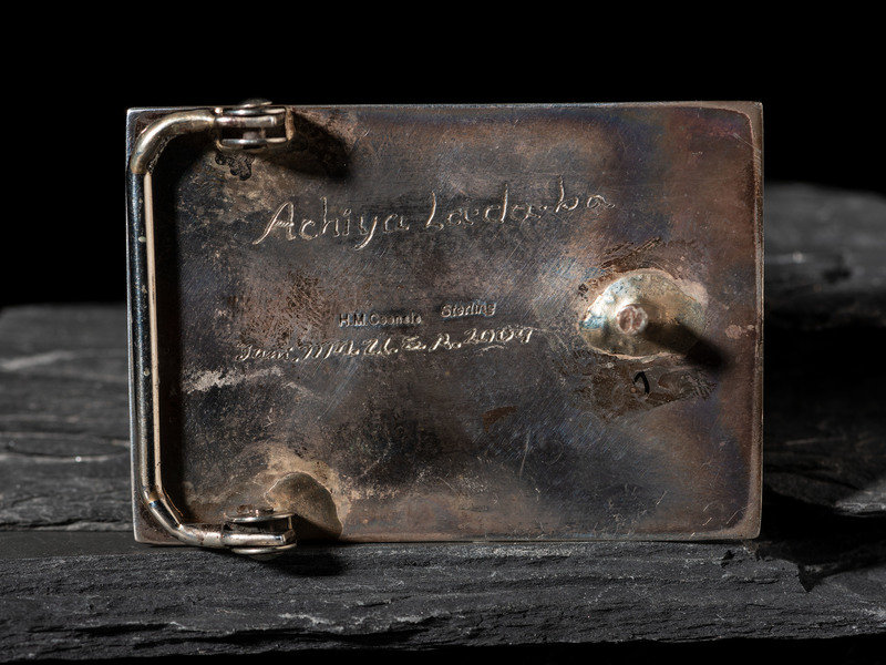 length 3-1/4 inches x width 2-7/8 inches, belt width 2-5/8 inches, weight 42.7 dwt.