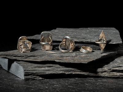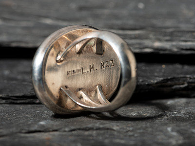 one with a split shank and set with a single cabochon; sigend L.M.NEZ and marked STERING