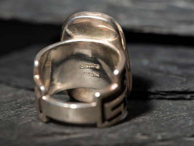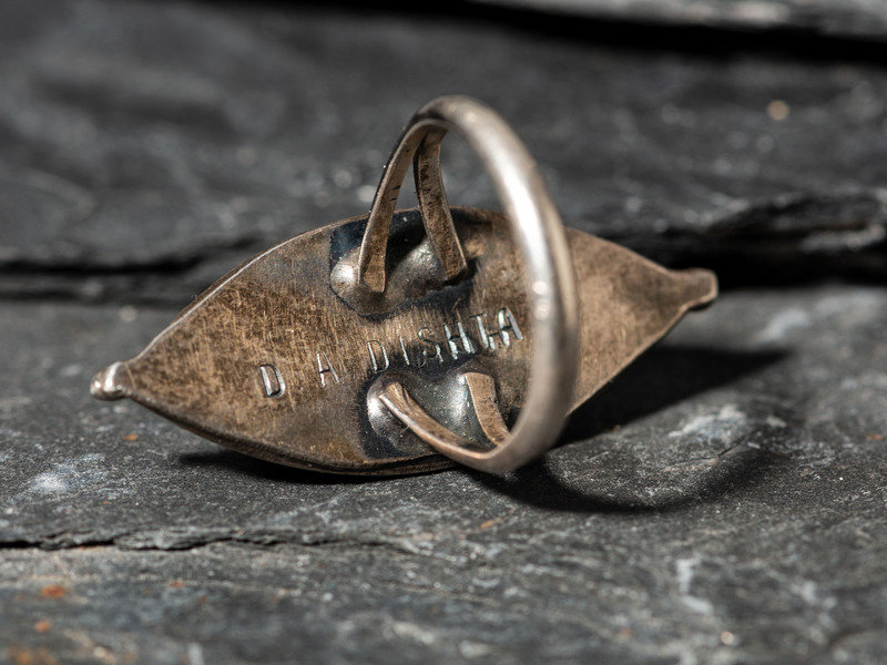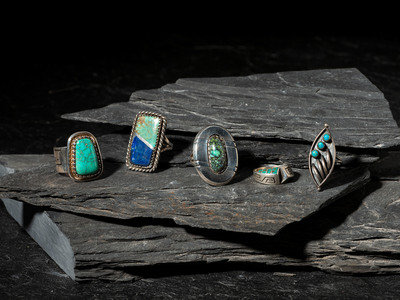 one with a silver overlay shank and set with a turquoise cabochon; signed ALVIN TSO and marked STERLING