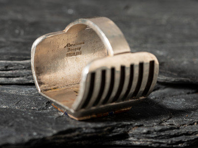 a silver example with mosaic inlay horse head; not marked