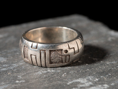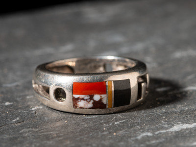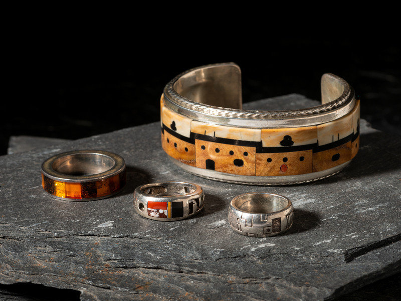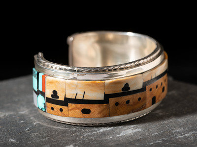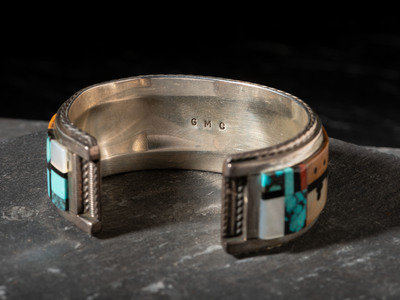 a cuff with mosaic inlay pueblo scene; marked GMC STERLING