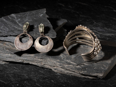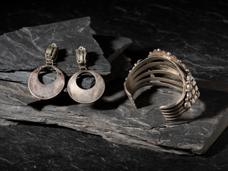 a pair of Zuni silver clip earrings with channel inlaid shell; not marked