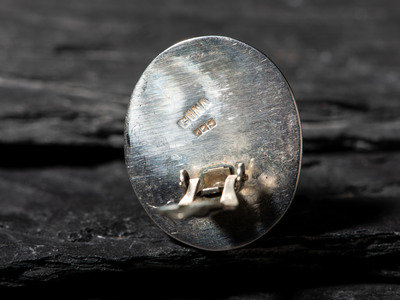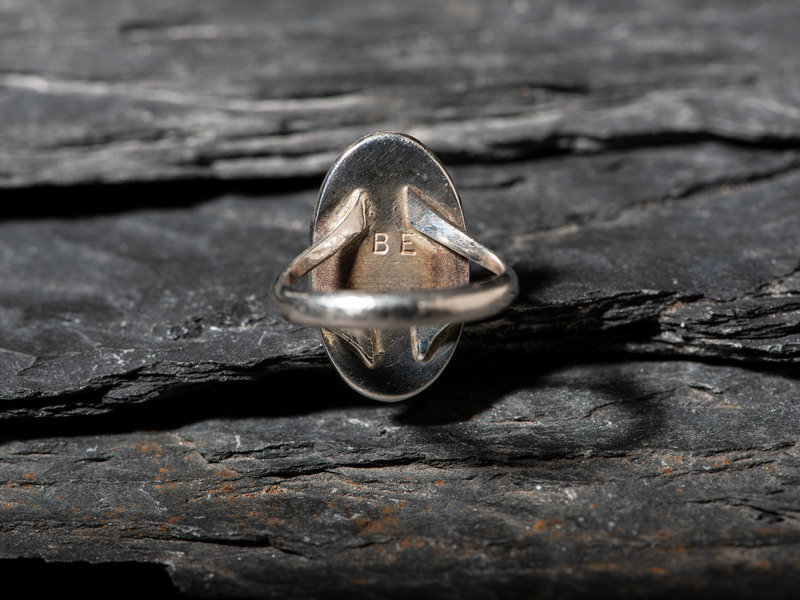 a Zuni ring with coral, jet, and shell channel inlay; marked BE