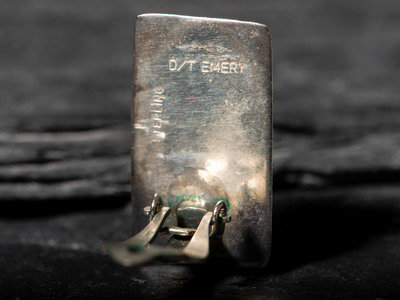 a rectangular pair set with charoite; marked D/T EMERY