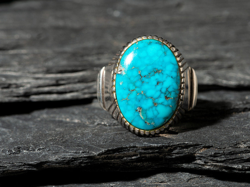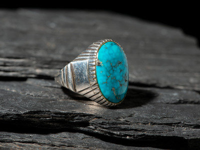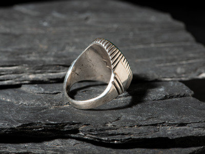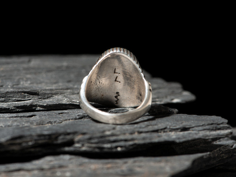 cast silver ring with large high grade stone; marked LL and the artist's snake hallmark