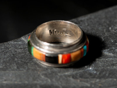 set with turquoise, coral, and ironwood; signed LOLOMA