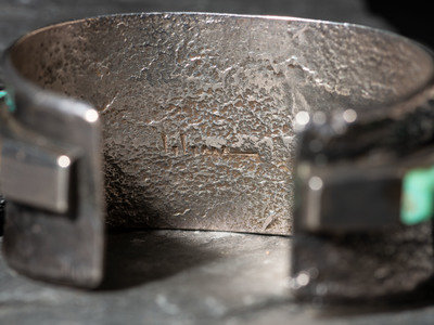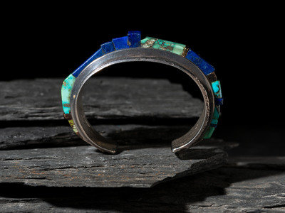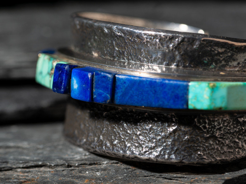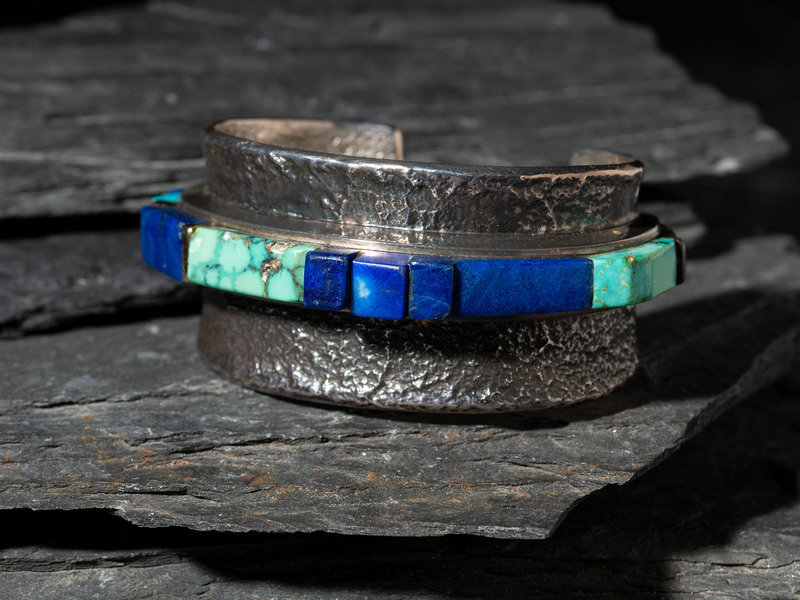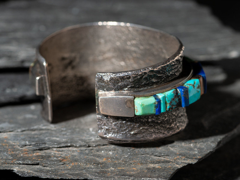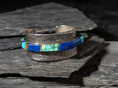 silver cuff, set with turquoise and lapis with 14K gold spacers in varying heights; signed LOLOMA on reverse