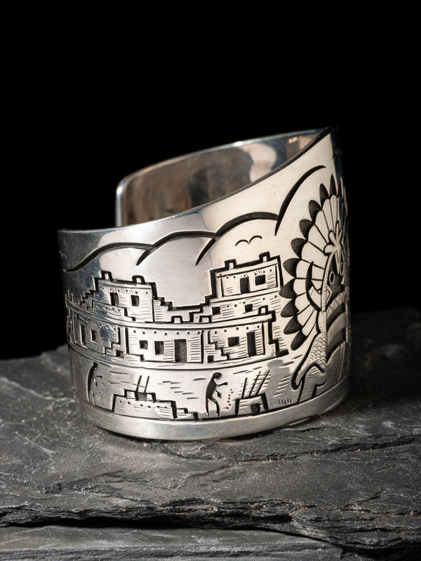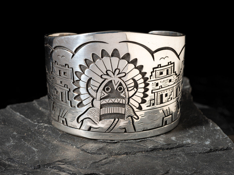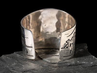Silver Overlay Katsina and Pueblo Cuff Bracelet