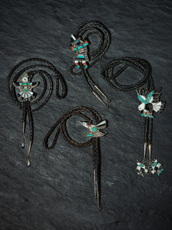 one with a roadrunner slide, set with turquoise, coral, shell, and jet; not marked
