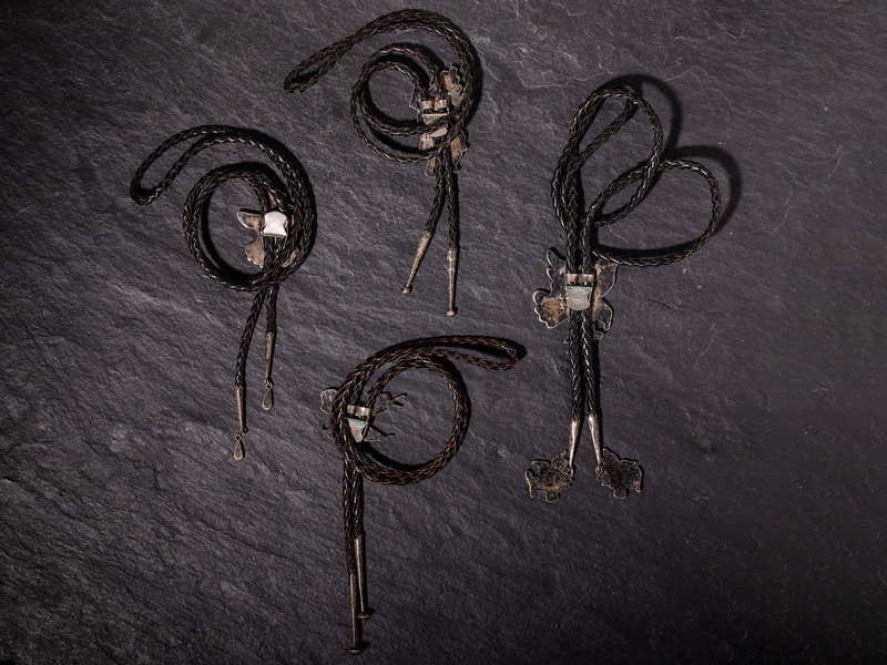 one with a Rainbow Man slide, set with turquoise, spiny oyster, shell, and jet; not marked