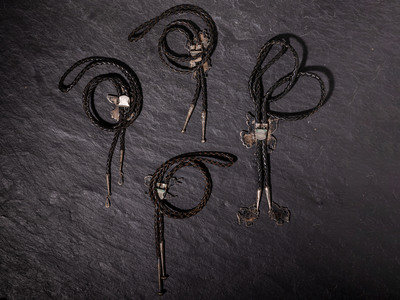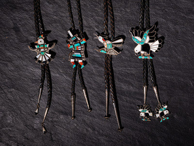 one with a Thunderbird slide, set with turquoise, spiny oyster, shell, and jet; not marked