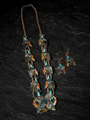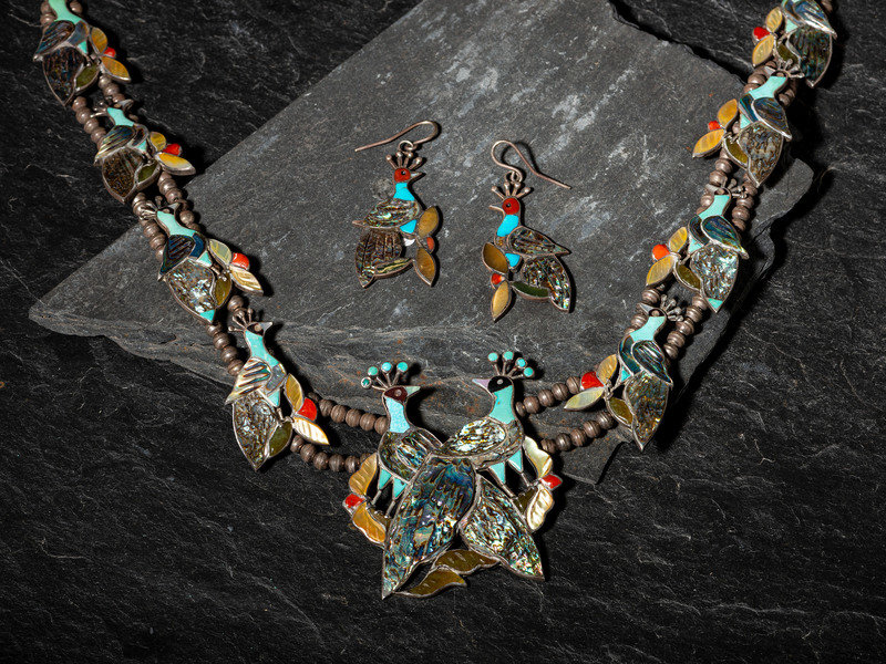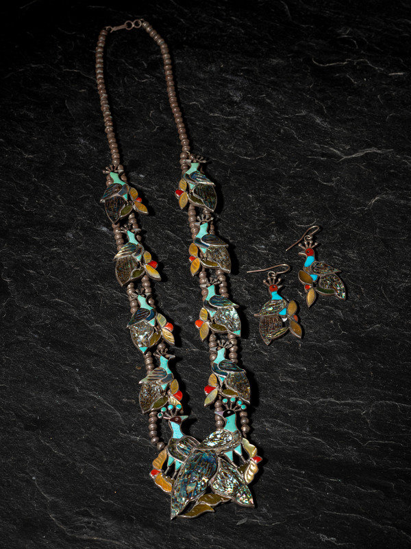 Mosaic Inlay Peacock Squash Blossom Necklace, PLUS Hook Earrings