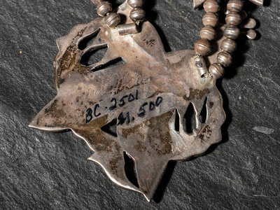 a squash blossom necklace with double intertwined peacock naja centered between eight individual peacock squash blossoms; etched signature on back of naja