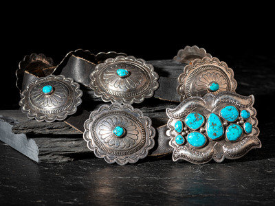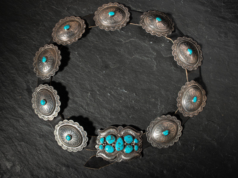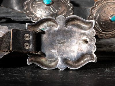nine heavily stamped oval conchas with scalloped edges, each set with a single turquoise cabochon; the rectangular buckle features a cluster of nine graduated turquoise cabochons accented with heavy stamping and repoussé; signed ORVILLE TSINNIE OF NEW MEXICO and marked STERLING
