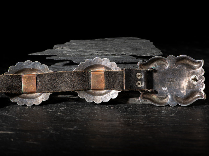 belt length 40-1/4 inches x width 1-1/8 inches, concha length 3 inches x width 2-1/2 inches, buckle length 3-5/8 inches x width 2-3/4 inches, total weight 338.9 dwt.