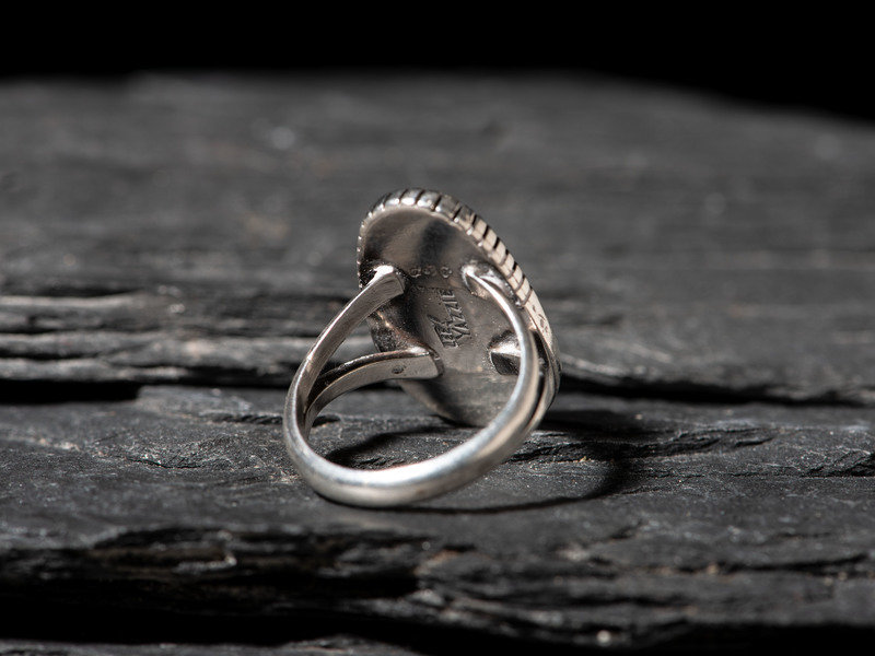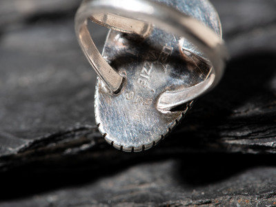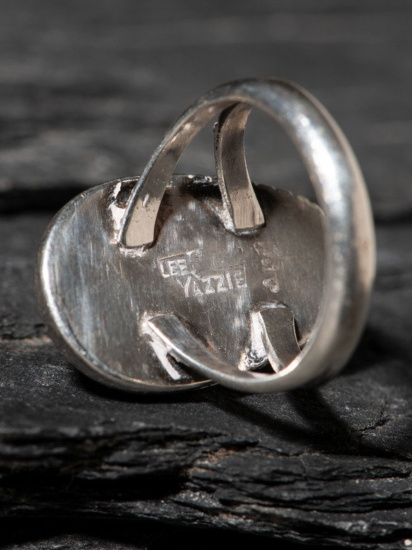 split shank silver ring, with shadow box setting; signed LEE YAZZIE, etched initials DVP
