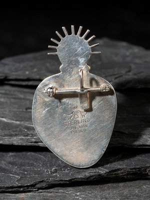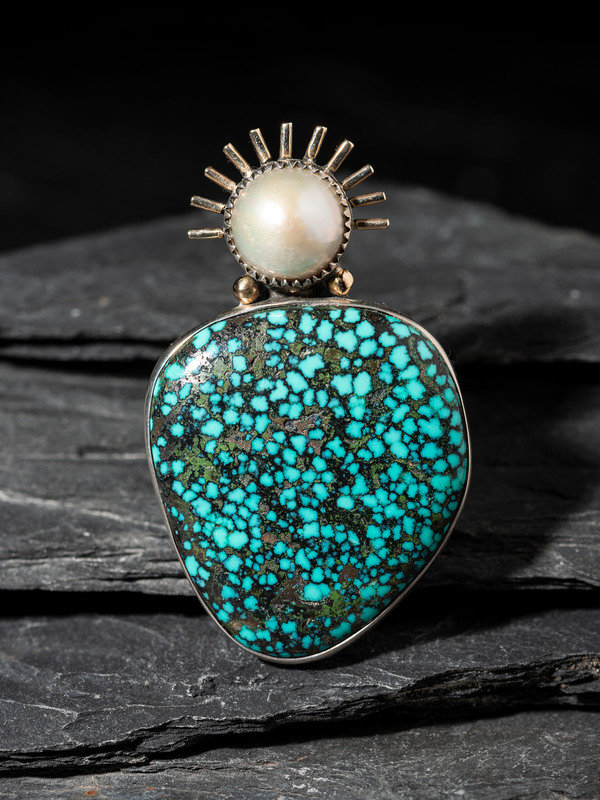 set with a large high-grade turquoise stone as the body, the head set with a pearl and accented with 18K gold tableta and earrings; marked with artist's bird hallmark STERLING 18K