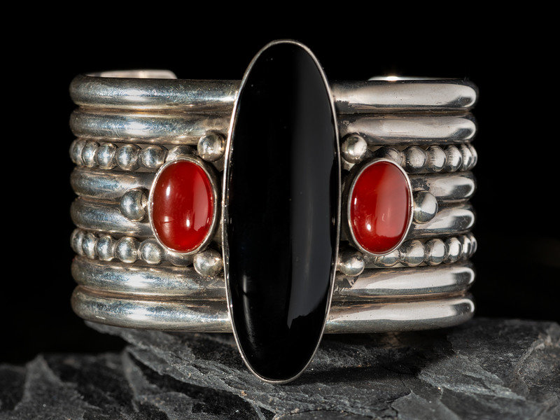 Sterling Silver, Jet, and Agate Cuff Bracelet