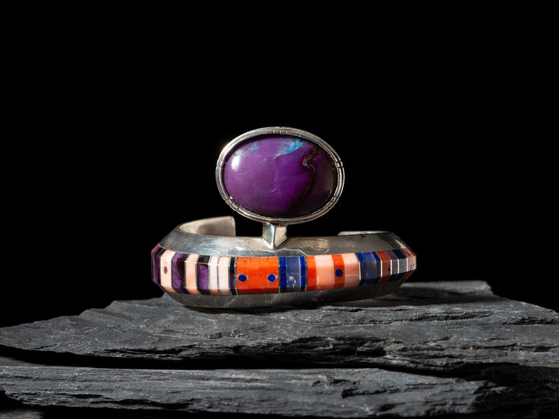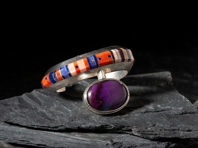 tapered shank set with pink and red coral, sugilite, lapis, and opal; marked GZN
