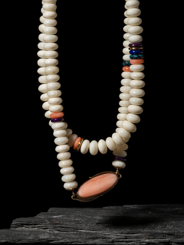 a necklace strung with white coral, pink coral, sugilite, and Chinese Turquoise, accented with 14K gold beads and clasp; not marked