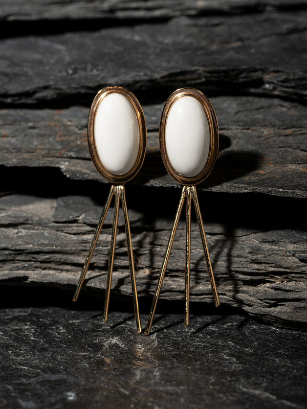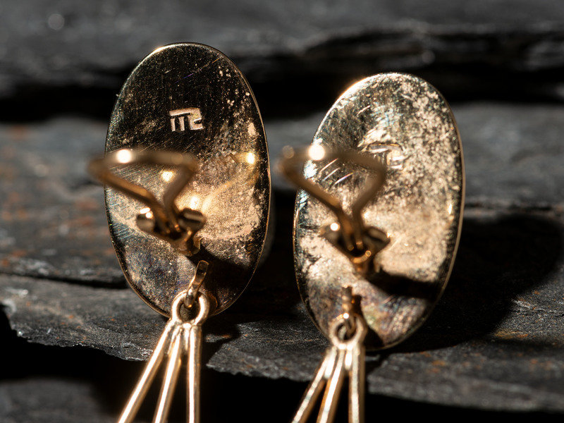 a pair of earrings set with dolomite cabochons and accented with detachable gold dangles; marked with artist's conjoined RC hallmark