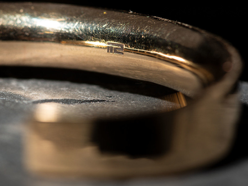 cuff width 1/2 inch, interior circumference 5-3/4 inches x gap length 1-1/8 inches, weight 18.1 dwt.