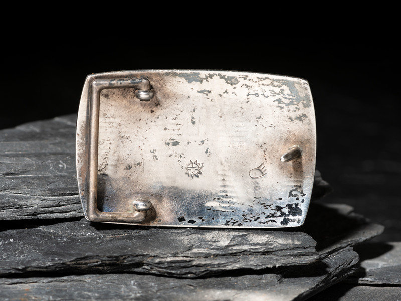 a buckle marked with a sunface hallmark for the Hopi Guild and paw print hallmark for Alde Qumyintewa