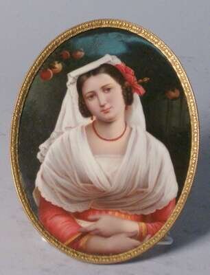 Oval, finely painted in the Berlin manner, with a portrait of an Italian girl in native costume. H: 5 1/4, W: 7 in.