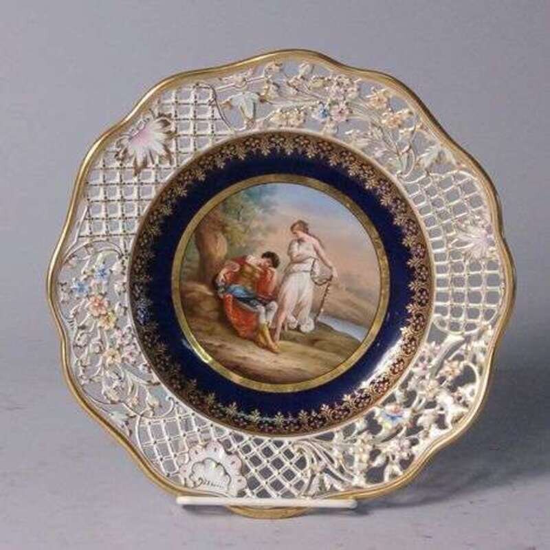 Bearing Vienna mark. Finely painted in colors with the classically garbed Armida standing over the sleeping Rinaldo, set within an extensive background, framed by cobalt enriched in gilding, the whole within a shaped and pierced border. Dia: 9 1/2 in.