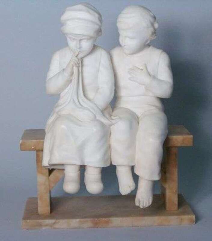 Modeled as a young boy comforting a girl seated on a bench. H: 19, W: 15 in.