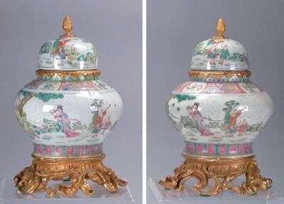 PAIR OF GILT-BRONZE-MOUNTED FAMILLE ROSE CHINESE PORCELAIN COVERED VASES