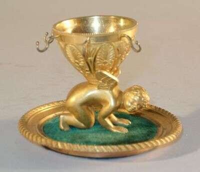 Formed as a kneeling Eros supporting a cup ornamented with anthemion, with a circular base. H: 3 in.