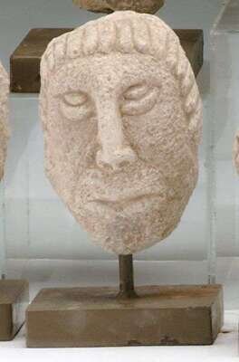 Architectural fragment mounted on a modern base. Oval-shaped face with pronounced nose, well defined hair, open eyes with heavy bags in an expression of sleeplessness. H: 9 in.
