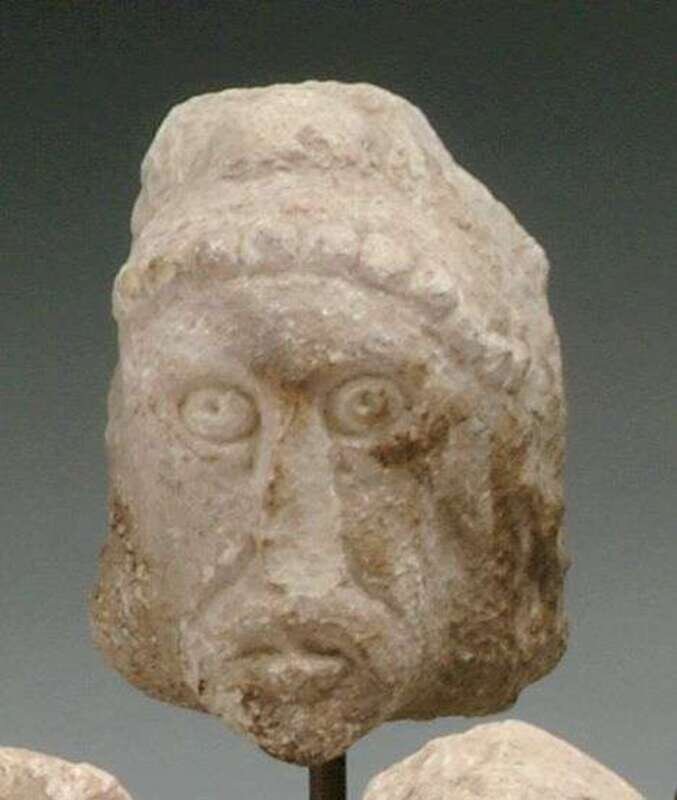 Architectural fragment mounted on a modern base. Oblong face with eyes wide open, pursed lips, and missing nose. H: 9 1/2 in.