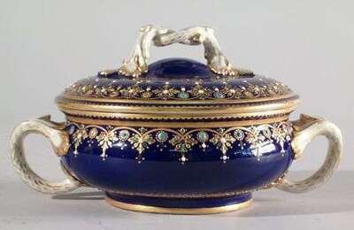 Bears Sevres mark, with branch-form handles and finial and decorated with enameled "jewelling" against a cobalt ground. H: 5, Dia: 5 1/2 in.